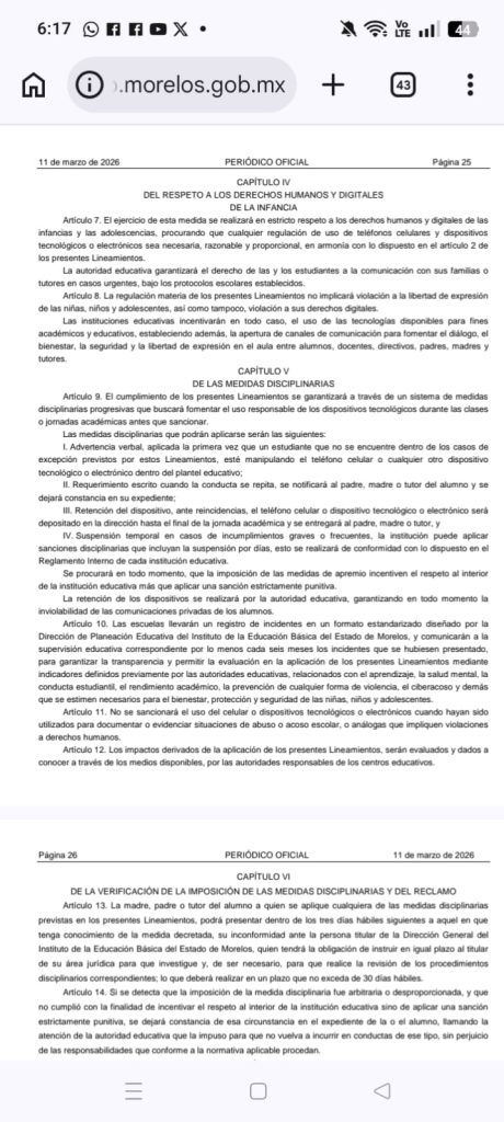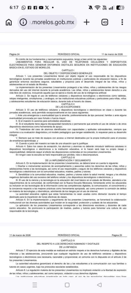 En el periódico original tierra y libertad órgano de difucion del gobierno del Estado de Morelos se publicaron lo lineamientos para regular el uso de teléfonos celulares y dispositivos electrónicos para generar entornos digitales seguros e instituciones de educación básica del estado de Morelos.