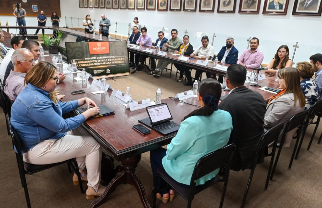 El acuerdo fue signado en el salón Morelos de Palacio de Gobierno, donde la titular del Poder Ejecutivo e integrantes del gabinete de bienestar sostuvieron un encuentro con el director general de la Congregación, Rubén David Leyva Mendoza, y su coordinador en Morelos, Miguel Ángel Fuentes Solano.