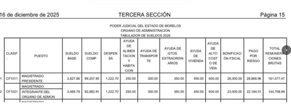 Sin embargo, de acuerdo con el tabulador de sueldos publicado en el Periódico Oficial “Tierra y Libertad”, el magistrado presidente percibe alrededor de 161 mil pesos mensuales, mientras que magistrados e integrantes del Órgano de Administración ganan cerca de 144 mil pesos, montos superiores al sueldo de la presidenta de México, que es de aproximadamente 134 mil pesos mensuales.