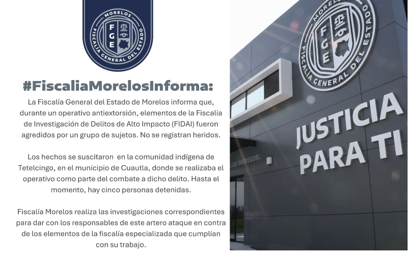 La Fiscalía General del Estado de Morelos informa que, durante un operativo antiextorsión, elementos de la Fiscalía de Investigación de Delitos de Alto Impacto (FIDAI) fueron agredidos por un grupo de sujetos. No se registran heridos.