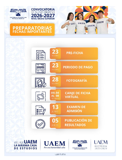 Dulce María Arias Ataide, titular de la dependencia, destacó que el proceso de admisión a la UAEM, ciclo escolar 2026-2027, continúa abierto y se encuentra en el periodo de pre registro, el cual debe realizarse a través de la página: superior.uaem.mx para el caso de nivel superior, que incluye licenciaturas e ingenierías, y en la página: en medio.uaem.mx para quienes desean cursar el bachillerato.