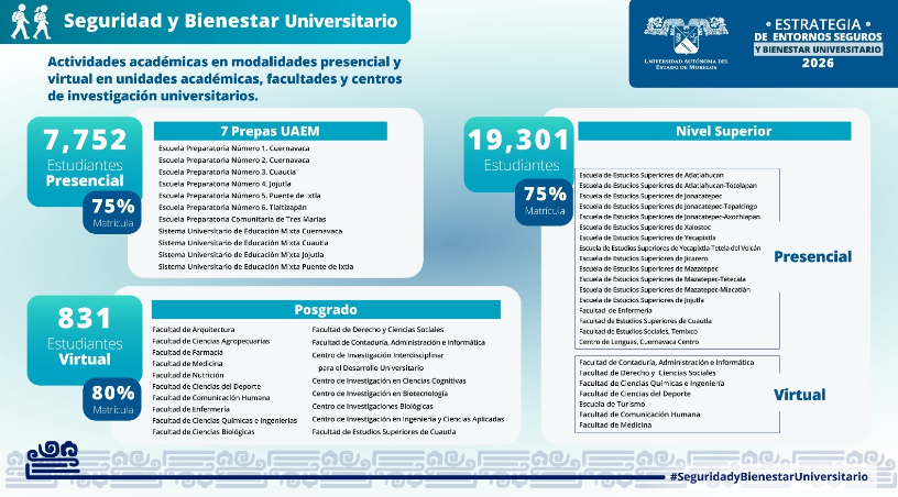 La Universidad Autónoma del Estado de Morelos (UAEM) informó la implementación de un esquema de actividades académicas en modalidades presencial y virtual, como parte de su Estrategia de Entornos Seguros y Bienestar Universitario 2026, con el objetivo de garantizar la continuidad educativa en todas sus unidades académicas, facultades y centros de investigación.