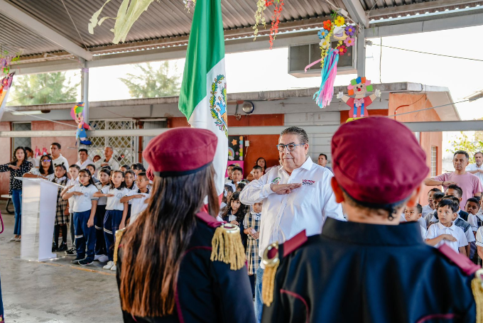 El senador de Morena por Morelos, Víctor Mercado Salgado, estuvo presenta en los honores a la Bandera con estudiantes, padres de familia y maestros de la escuela Fausto Molina, ubicada en la colonia Rubén Jaramillo, en el municipio de Temixco.