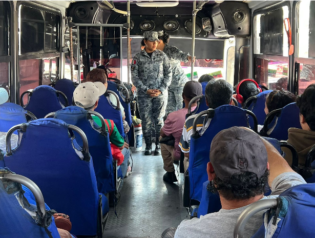 En la zona metropolitana del municipio de Cuernavaca, de manera aleatoria, los guardias nacionales solicitan a los operadores detener sus unidades, para efectuar revisiones preventivas a los pasajeros y de manera disuasiva inhibir la portación de armas u objetos que puedan ser utilizados para la comisión de algún delito.