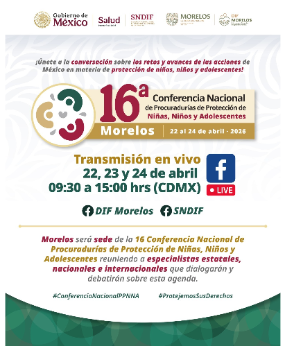 El Sistema para el Desarrollo Integral de la Familia del Estado (SEDIF) informó que los días 22, 23 y 24 de abril, Morelos será sede de la 16ª Conferencia Nacional de Procuradurías de Protección de Niñas, Niños y Adolescentes, una iniciativa impulsada por el Sistema Nacional DIF (SNDIF) que reunirá a representantes de las 32 entidades federativas, titulares del Poder Judicial e integrantes de la Red de Impulsoras e Impulsores de la Transformación, con el propósito de fortalecer el trabajo interinstitucional y construir estrategias conjuntas en favor de la protección de las infancias y adolescencias de México.