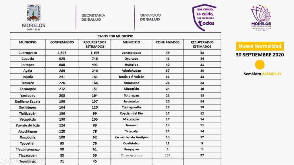 En cuanto a los casos de contagio en municipio son Cuernavaca 1525, Cuautla 925, Jiutepec 600, Jojutla 241, Ayala 289, Temixco 226, Zacatepec 212, Emiliano Zapata 196, Xochitepec 164, Yautepec 208, Xoxocotla 100, Tlaltizapán 136, Puente de Ixtla 124, Axochiapan 120, Yecapixtla 130, Tlaquiltenango 88, Tepalcingo 71, Tepoztlán 95, Tlayacapan 83, Atlatlahucan 37, Tetela del Volcán 31, Ocuituco 41, Huitzilac 40, Miacatlán 24, Jonacatepec 49, Jantetelco 20, Amacuzac 26, Coatetelco 11, Coatlán del Río 17, Mazatepec 17, Zacualpan de Amilpas 13, Tlalnepantla 19, Totolapan 22, Tetecala 15, Temoac 17, Hueyapan 1 y otros estados 132.
