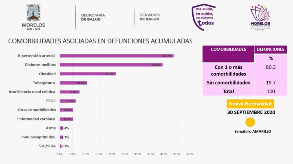 El 43.7% tenía hipertensión arterial, 39.5% diabetes mellitus, 21.5% obesidad, tabaquismo 10.6%, insuficiencia renal 7.6%, EPOC 6.1%, otras comorbilidades 5.2%, enfermedades cardiacas 5.2%, asma 1.4%, inmunosuprimidos 1.3% y VIH/SIDA 0.7%.
