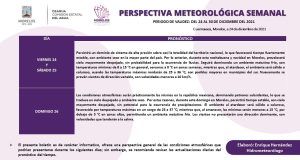 La Comisión Estatal del Agua (Ceagua) emite la perspectiva meteorológica referente a las condiciones que prevalecerán en el periodo del 05 al 08 de diciembre, en el que se prevé cielo despejado, ambientes fríos por las mañanas y caluroso en el transcurso del día. Con excepción de estados del noroeste ...