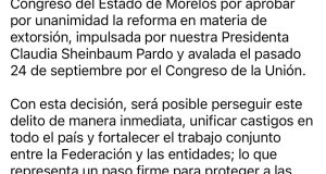 La gobernadora de Morelos, Margarita González Saravia, reconoció la aprobación unánime de las diputadas y diputados del Congreso del Estado a la reforma en materia de extorsión, impulsada por la presidenta Claudia Sheinbaum Pardo y avalada el 24 de septiembre por el Congreso de la Unión. Destacó que esta medida ...