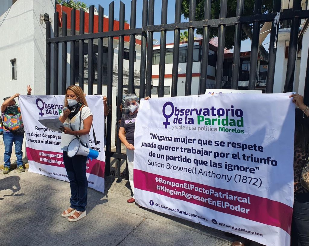 Mujeres protestan ante el Instituto Morelense de Procesos Electorales y Participación Ciudadana (Impepac) para exigir que se vigile por las instituciones públicas que los candidatos cumplan con los lineamientos tres de tres con perspectiva de género.