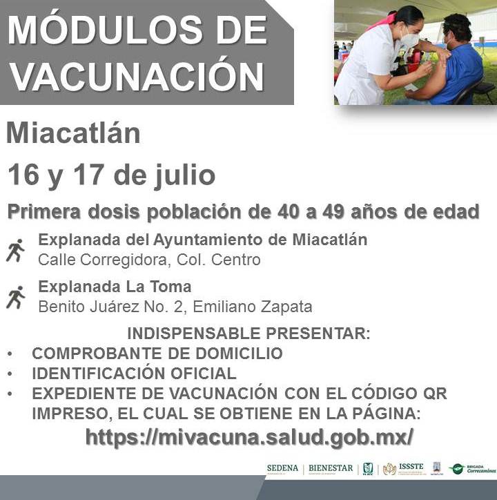 En el municipio de Miacatlán, la inmunización con primeras dosis de la vacuna AstraZeneca para personas de 40 a 49 años, se realizará el viernes 16 y sábado 17 de julio a partir de las 9:00 a.m. y hasta concluir las dosis asignadas en: